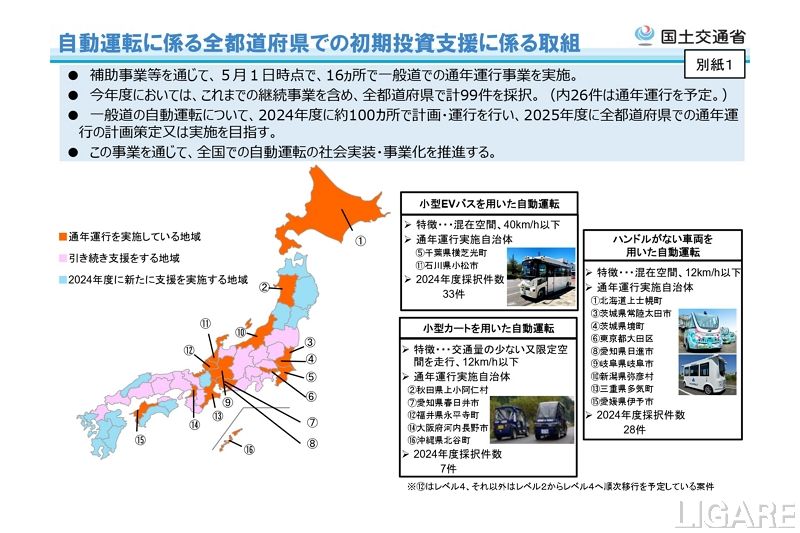 国土交通省は6月7日、地域公共交通確保維持改善事業費補助金(自動運転社会実装推進事業)において、全国を網羅する形で約100事業の採択を発表した。