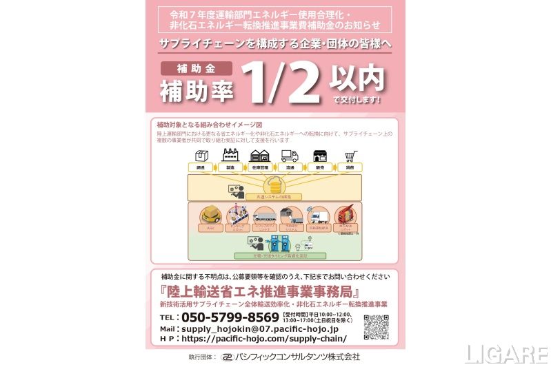 今回の募集で補助対象となる経費は、「発荷主、輸送事業者、着荷主等の事業者間における輸送情報等の連携にあたり必要な共通システムに要する経費」、「共通システムと情報連携する輸送効率化機器の導入により輸送計画全体の最適化実証に要する経費」、「共通システムと連携することによりEVトラックやFCVトラックへの充電・充填タイミング等の最適化実現に向けた実証に要する経費」の3種類だ。物流事業者、荷主事業者等を行う事業者を対象に、1/2以内の経費で補助を行う予定だ。なお、今回の公募期間は6月5日~9月30日であり、7月10日、8月21日、9月30日の3回に分けて申請を締め切るという。