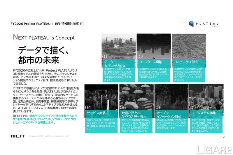 今回の取り組みでは、国、地方公共団体、民間事業者、研究機関等の多様なプレイヤーがそれぞれのイニシアティブで取り組みを進める「PLATEAU エコシステム」の本格構築に向けた施策を講じていく。具体的には、データカバレッジの拡大、ユースケース開発、コミュニティ形成、サービス実装、地域のデジタルケイパビリティ向上、オープン・イノベーション創出、エコシステム構築の7つのテーマで情報提供依頼(RFI#1)を実施するとのことだ。なお、詳細は以下で公開されている。