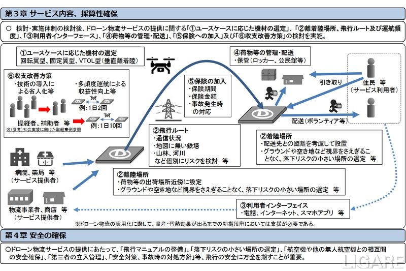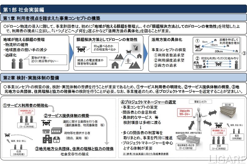 今回のガイドラインでは、第1部から第4部までで構成されている。第1部の社会実装編では、「利用者視点を踏まえた事業コンセプトの構築」「検討・実施体制の整備」などをまとめた。第2部の法令編では、「航空法に基づく安全の確保」などをまとめている。なお、ガイドラインの概要は、以下で公開されている。