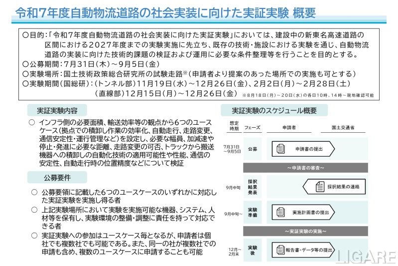 国土交通省道路局は7月29日、「自動物流道路」の構築に向けた最終とりまとめ(案)を公表。建設中の新東名高速道路の区間では2027年度までに実験を実施すること、および参加する事業者の公募開始を発表した。