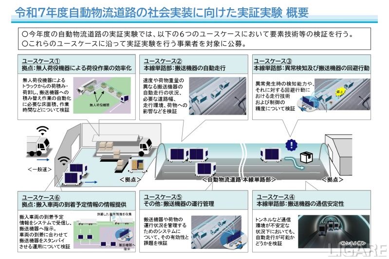 同実証では、インフラ側の必要面積、輸送効率や事業性の観点から6つのユースケース(拠点での積卸し作業の効率化、自動走行、走路変更、通信安定性・運行管理など)を設定。必要な幅員、加減速や停止・発進に必要な距離、走路変更の可否、トラックから搬送機器への積卸しの自動化技術の適用可能性や性能、通信の安定性、自動走行時の位置精度などについて検証を行