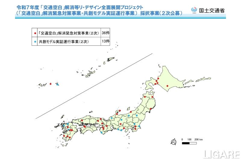 国土交通省は8月7日、2025年度「『交通空白』解消等リ・デザイン全面展開プロジェクト」(「交通空白」解消緊急対策事業・共創モデル実証運行事業)の2次公募を行い、「『交通空白』解消緊急対策事業」36件、「共創モデル実証運行事業」13件の事業採択を発表した。