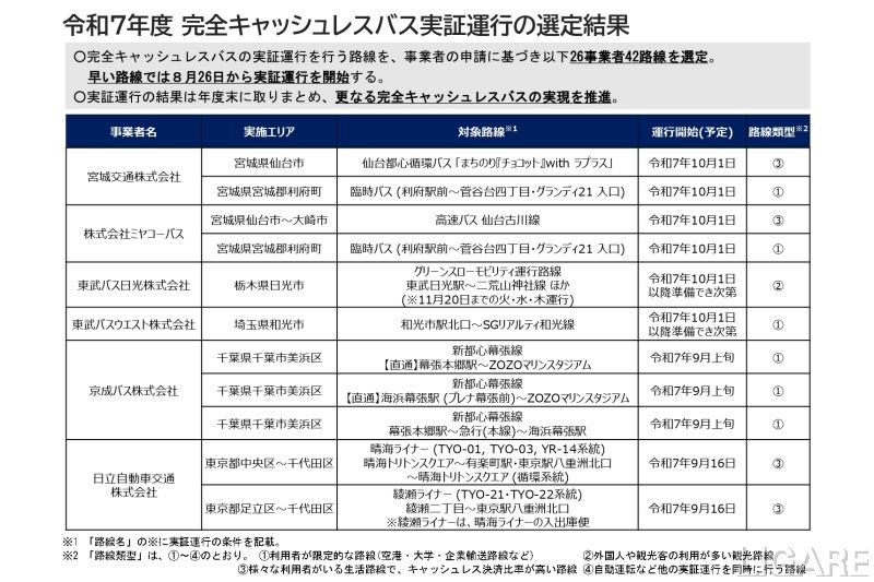 今回選定した路線は、6月26日~7月31日の間に公募を行った26事業者42路線であり、8月26日以降、順次運行を開始するという。そして、2026年3月以降に検証結果が公表される予定だ。