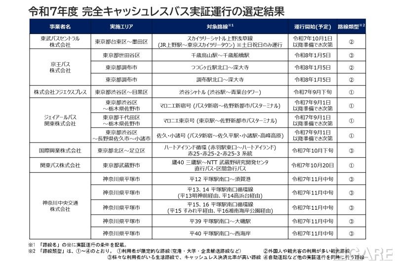 また、同省は、今回の取り組みやすい路線として、「利用者が限定的な路線(空港・大学・企業輸送路線など)」、「外国人や観光客の利用が多い観光路線」、「さまざまな利用者がいる生活路線で、キャッシュレス決済比率が高い路線」、「自動運転など他の社会実験を同時に行う路線」の4種類を挙げている。