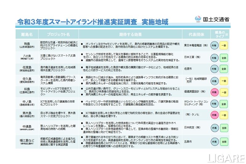 国土交通省は、同調査で得られた成果や知見を全国に普及・展開させることで、より一層のスマートアイランドの推進及び離島地域の活性化に繋げていくと述べている。なお、各事業の詳細は以下のURLで公開されている。
