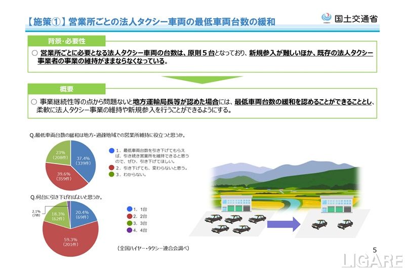 今回の改正は、5月22日に開催された第4回「ラストワンマイル・モビリティ/自動車DX・GXに関する検討会」で 「ラストワンマイル・モビリティに関する制度・運用の改善策」として提案されたものだ。具体的には、法人タクシー事業の許可、または事業計画の認可に当たって、営業所ごとに原則5両の事業用自動車を配置することが困難と地方運輸局長が認める地域については、例外的に1両以上5両未満とすることができることを明示するなどだ。