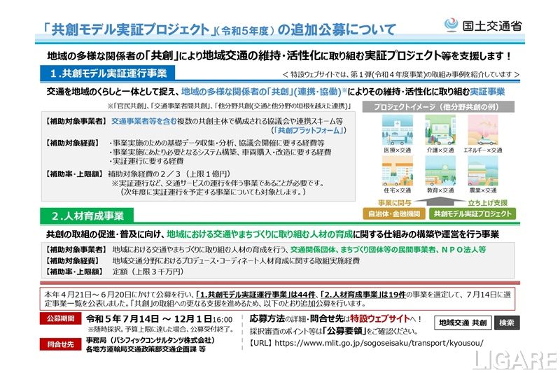 同省は、今回の全面施行により、『地域の関係者の連携と協働の促進』、『エリア一括協定運行事業」の創設』、『ローカル鉄道の再構築に関する仕組みの創設・拡充』、『交通分野におけるDX・GXを推進する「道路運送高度化事業」の拡充(※7月1日施行済)』、『鉄道・タクシーにおける協議運賃制度の創設』、『社会資本整備総合交付金の拡充、新たな基幹事業の追加』を実施する。具体的には、『地域の関係者の連携と協働の促進』において、「共創モデル実証プロジェクト」の公募を行い、「共創モデル実証運行事業」を44件、「人材育成事業」を19件選定した。さらに、同省は、「共創モデル実証プロジェクト」の追加公募を行っている。追加公募期間は7月14日~12月1日だ。