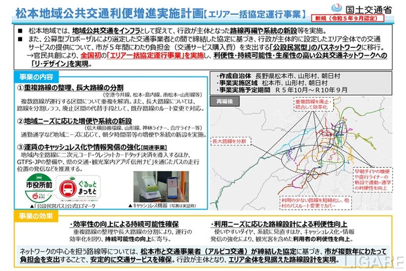また、同省は、『エリア一括協定運行事業」の創設』において、長野県松本市・山形村・朝日村から申請された「松本地域公共交通利便増進実施計画」を9月29日付で認定した。同計画では、地方公共団体が交通事業者と協定を締結し、安定的な交通サービスの確保を図る「エリア一括協定運行事業」が位置づけられている。同事業が実施されるのは、全国初となる。