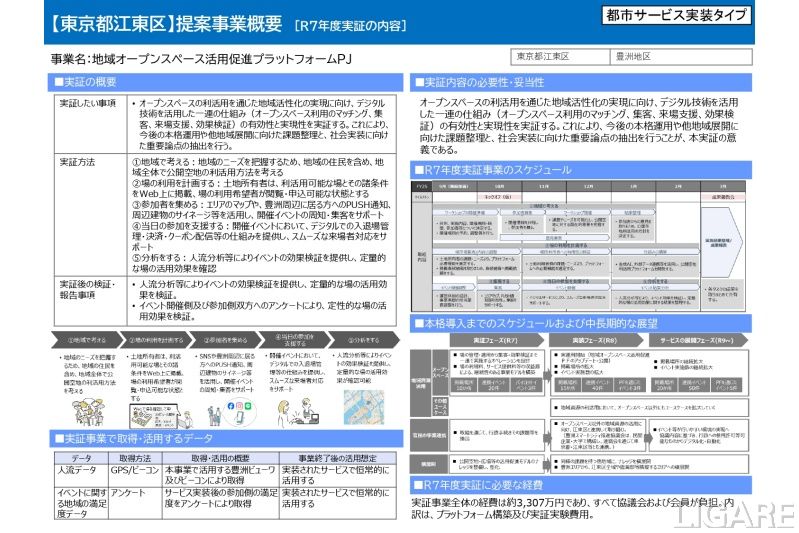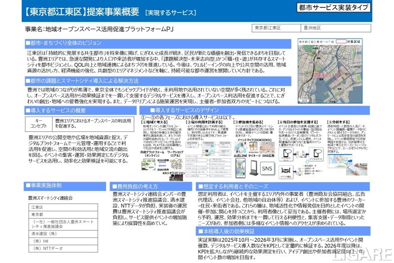 東京都江東区は、地域のにぎわいの創出・地域への愛着強化を実現するため、オープンスペースの利活用促進に向け、デジタル技術を活用した一連の仕組み(オープンスペース利用のマッチング、集客、来場支援、効果検証)の有効性と実現性の検証を実施するという。
