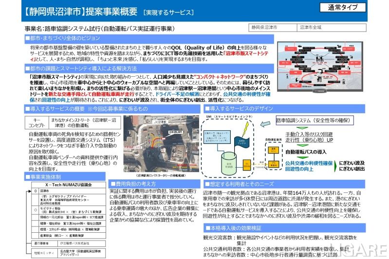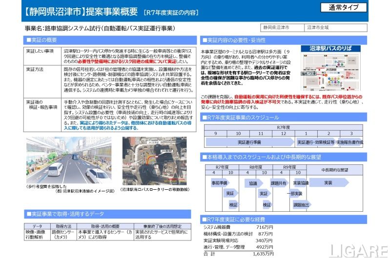 一方、静岡県沼津市は、人口減少も見据えた“コンパクト+ネットワーク”のまちづくりを推進し、車中心からヒト中心のウォーカブルな空間へと再編するため、また、ドライバー不足の解消、公共交通の利便性確保による回遊性向上のため、自動運転車両バスの実証にあたり、路車協調整備の在り方を検証し、整備そのものの必要性や整備時におけるリスク回避の成果について検証を実施するとのことだ。