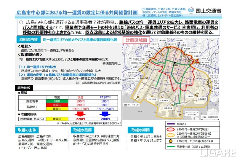 広島電鉄株式会社、広島バス株式会社、広島交通株式会社、中国ジェイアールバス株式会社、芸陽バス株式会社、備北交通株式会社、エイチ・ディー西広島株式会社の7社は、2022年9月6日付で「広島市中心部における均一運賃の設定に係る共同経営計画」を申請していた。