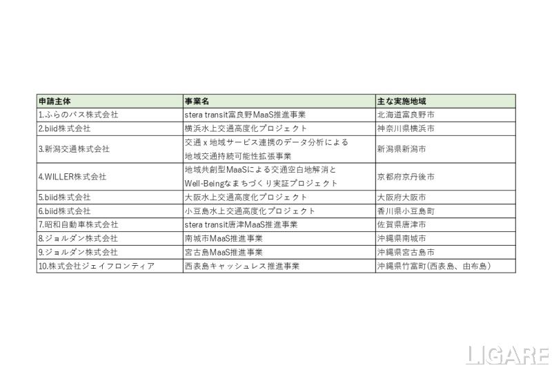 今回選定された事業は、ふらのバスが申請したstera transit富良野MaaS推進事業、bild社が申請した横浜水上交通高度化プロジェクト、新潟交通が申請した交通×地域サービス連携のデータ分析による地域交通持続可能性拡張事業、WILLER社が申請した地域共創型MaaSによる交通空白地域解消とWell-Beingをむすびつける実証プロジェクト、bild社が申請した大阪水上交通高度化プロジェクト、bild社が申請した小豆島水上交通高度化プロジェクト、昭和自動車が申請したstera transit唐津MaaS推進事業、ジョルダンが申請した南城市MaaS推進事業、ジョルダンが申請した宮古島MaaS推進事業、ジェイフロンティアが申請した西表島キャッシュレス推進事業の全10事業だ。