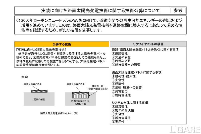 国土交通省は12月1日、路面太陽光発電技術を道路空間に導入するにあたって求める性能等を確認するため、新たな技術を公募すると発表した。