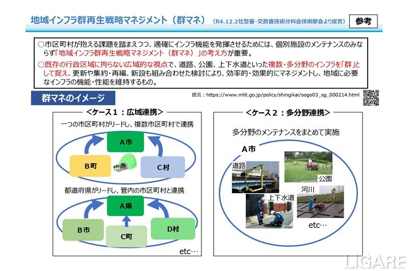 国土交通省は、群マネの取り組みを全国的に展開していくため、群マネの計画策定や業務の実施に関して、具体的に検討を進めていくこととしている。群マネは、既存の行政区域に拘らない広域的な視点で、道路、公園、上下水道といった複数・多分野のインフラを「群」として捉え、更新や集約・再編、新設も組み合わせて検討。これにより、効率的・効果的にマネジメントし、地域に必要なインフラの機能・性能を維持するものだ。