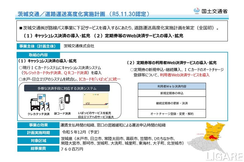 国土交通省は12月7日、「道路運送高度化実施計画」について、11月30日付けでの茨城交通株式会社・伊予鉄グループの2件の認定を発表した。今回の認定は、全国初となる、地域公共交通の活性化および再生に関する法律(以下、地域交通法)に基づく道路運送高度化実施計画の認定案件となる。