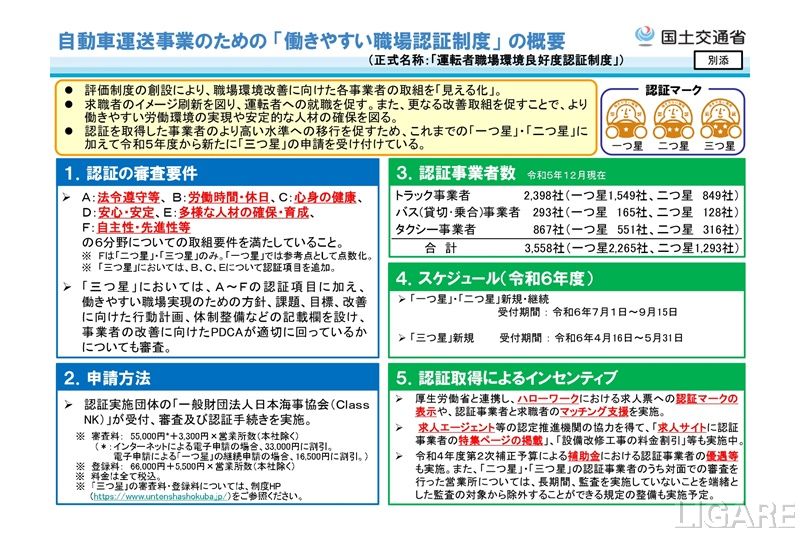 同制度は、運転者の労働条件や労働環境に関して評価・認証する制度だ。自動車運送事業における労働条件や労働環境に対する求職者のイメージ刷新を図り、運転者への就職を促進することを目的としている。さらに、各認証項目の達成状況に応じて「一つ星」・「二つ星」・「三つ星」の3つの認証段階が設けられている。