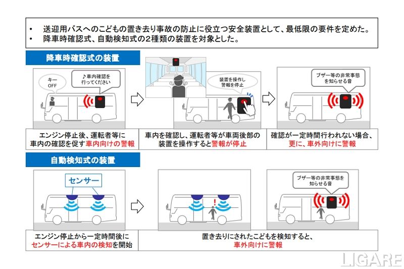 国交省、送迎用バスの置き去り防止を支援する安全装置のガイドライン策定
