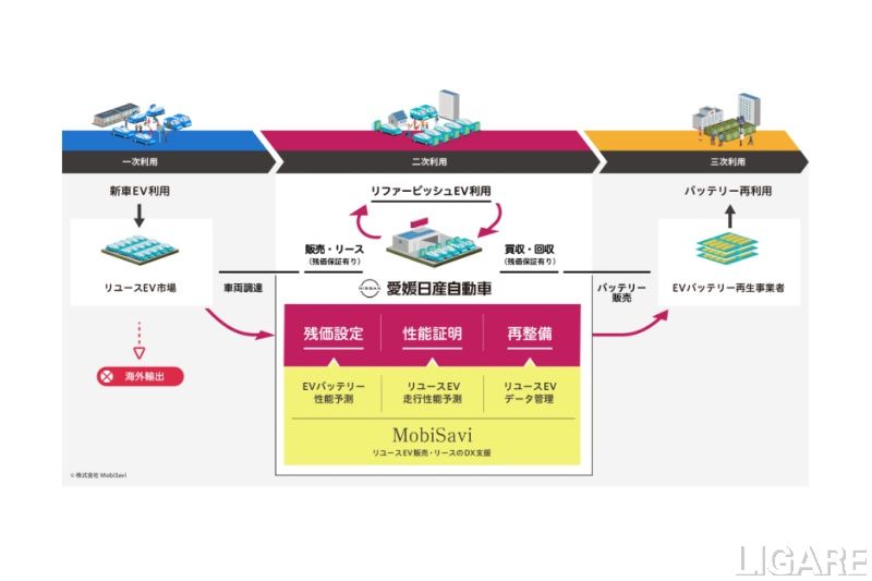 MobiSaviと愛媛日産自動車(以下、愛媛日産)は5月7日、EVサーキュラーエコノミーを目指し、リユースEVを用いた新たなEV販売モデル構築に向けた検討開始を発表した。MobiSaviの前身は、ディー・エヌ・エーにおいて、モビリティ領域における新規事業が検討されるなかでスタートしたプロジェクトだ。
