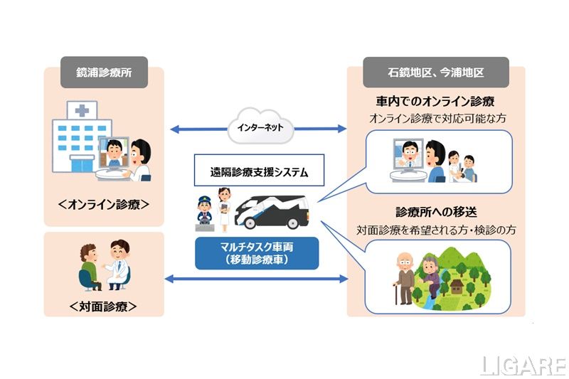 MONETは、同実証において、患者の自宅付近に訪問した車両内でオンライン診療を行う「医療MaaS」と、通院を必要とする患者を診療所まで移送する「患者移送サービス」を、1台のマルチタスク車両で提供する。そして、マルチタスク車両を曜日や時間帯によって用途を変更することで、患者の受診機会の拡大と車両の稼働率の向上を目指す。1台のマルチタスク車両を移動型の医療サービスと患者移送サービスに併用するのは、全国として初だ(MONET調べ。2023年12月6日時点)。