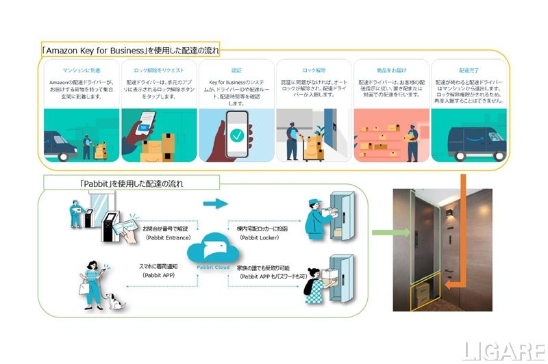 一方、「Pabbit」は、マンションの各住戸専用ロッカーへ荷物の届けることができるサービスだ。宅配事業者は、配達中の荷物を持っており、かつ入居者が不在のときに、伝票番号や荷物情報等によりオートロックを解錠し入館するという。