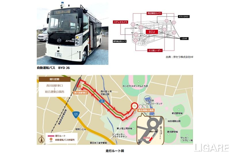 今回の実証実験は、栃木県総合運動公園と東武鉄道西川田駅を結ぶ区間で自動運転バスを運行する。同公園は、第77回国民体育大会「いちご一会とちぎ国体」の開会式・閉会式、および各種競技の会場だ。今回の実証実験では、国体期間中の来訪者の移動利便性向上を図る。