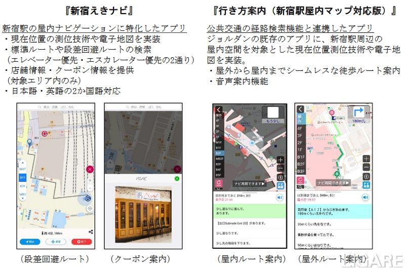 ジョルダンは、東京都から「ターミナル駅における屋内測位情報を活用した案内誘導に関する検討業務委託」を受託した。新宿駅を利用する人々がより円滑に移動できる環境を整備するため、民間による屋内案内誘導サービスの実現に取り組んでいる。今回の実証実験では、新宿駅の案内アプリ「新宿えきナビ」と「行き方案内(新宿駅屋内マップ対応版)」を提供した。