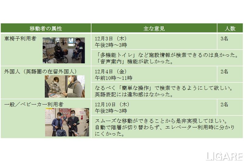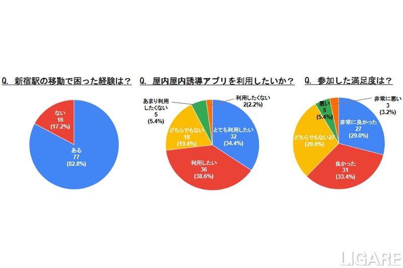 実証実験には146名が参加し、アプリの利用に対して一般参加者から97(有効数93)のアンケートを回収している。さらに、指定参加者からは、移動者の属性に応じたより詳細な意見聴取や利用実態の記録を行った。なお、今後は令和3年7月に、実証実験結果を踏まえた改良版の屋内案内誘導アプリを公開する予定だという。