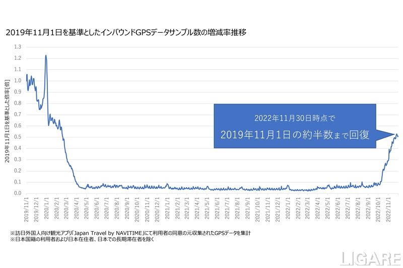 同システムの分析で利用しているインバウンドGPSデータの取得状況では、10月11日の水際対策の大幅な緩和以降、日本国内で取得できているGPSデータ量は急増中だ。2022年11月30日時点で、2019年11月1日の約半数までサンプル数が回復しているという。