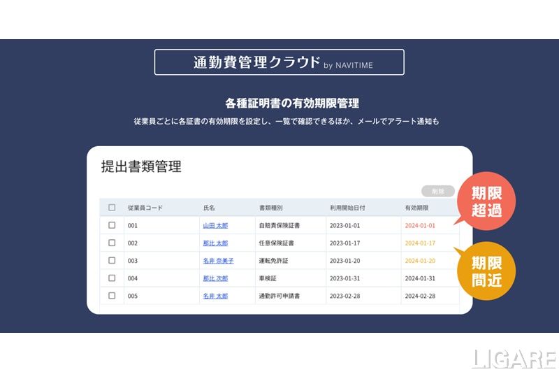 車とバイクの通勤費については、通勤日数・有料道路料金の扱い・全体にかかる割合・諸経費なども考慮できる「距離×単価式」、もしくは、距離に応じた手当支給額を自由にカスタマイズできる「テーブル式」から選択できる。さらに、社員一人ひとりの自賠責保険証書や運転免許証、車検証などの有効期限も登録でき、期限が近付いたことを知らせるメール通知機能も搭載している。