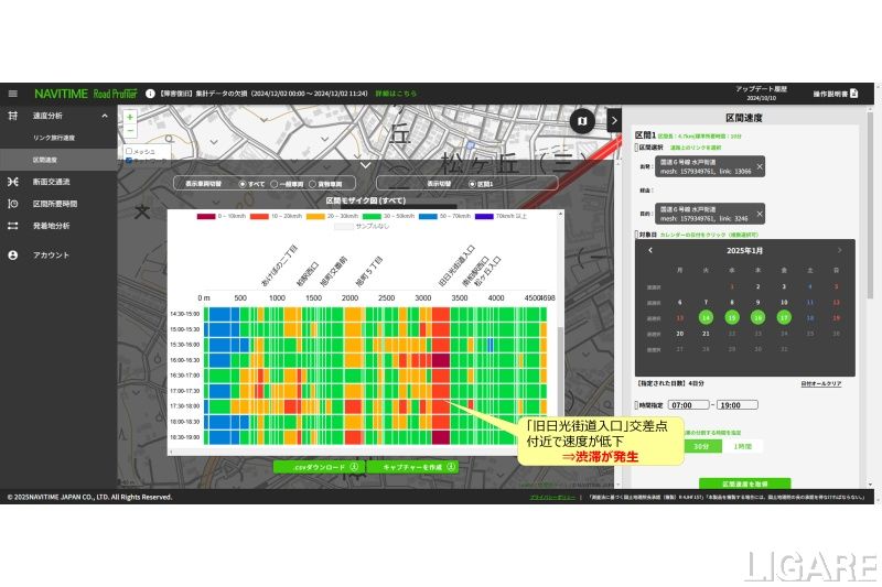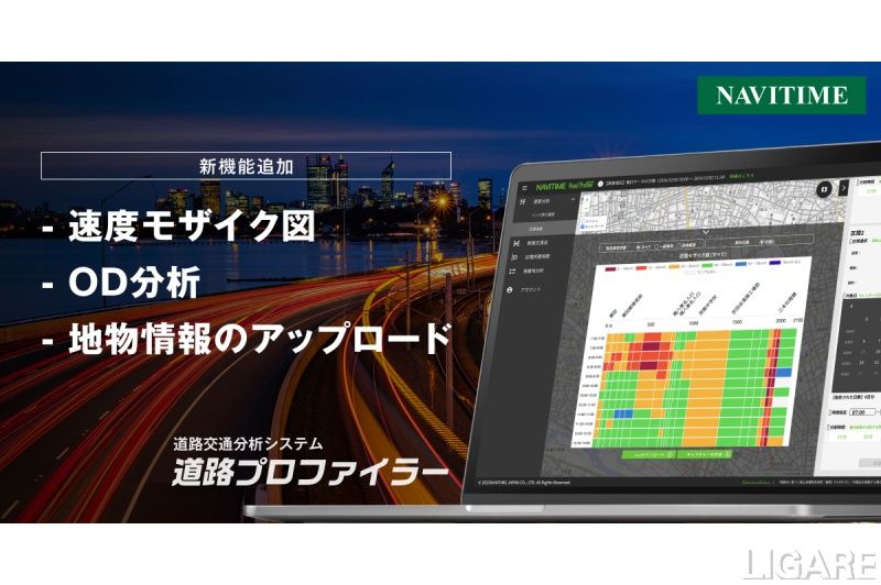 株式会社ナビタイムジャパンは2月4日、道路交通分析システム「道路プロファイラー」に、3つの新機能追加を発表した。これにより、道路単位の渋滞状況や、出発地・到着地の分析、施設情報を考慮した分析が可能になる。