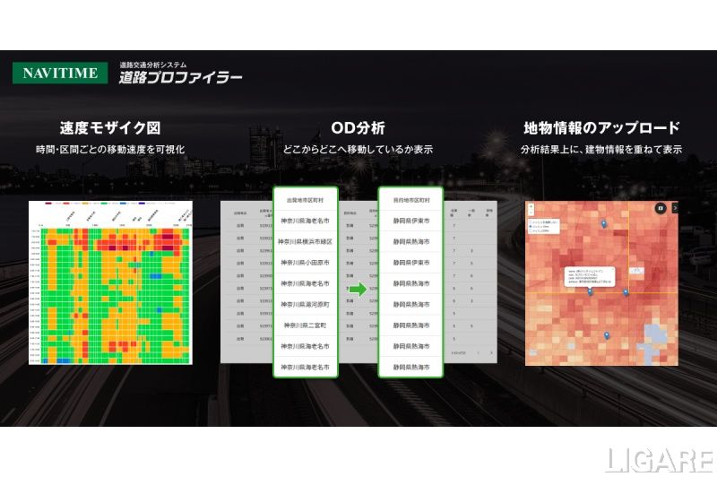 「道路プロファイラー」は、ナビタイムジャパンが提供するカーナビアプリにおいて、同意を得たユーザーの自動車プローブデータを取得し、そのデータをもとに全国の道路を対象とし、自動車の平均速度、走行経路、所要時間を、Web上で集計・可視化できる分析システムだ。今回の発表では、「区間速度分析(速度モザイク図)」「OD分析(自動車の出発地・到着地分析)」「地物情報アップロード機能」の3機能を追加している。