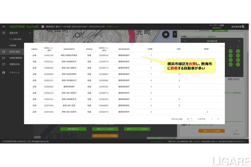 「OD分析」では、特定の道路(リンク)を通過した自動車の出発地・到着地も分析可能となり、市町村単位で出発地・到着地のペア、あるいはそのいずれかを表形式で表示できる。これにより、商圏や移動範囲など、道路の利用特性を狭域・広域で詳細に把握することが可能となった。