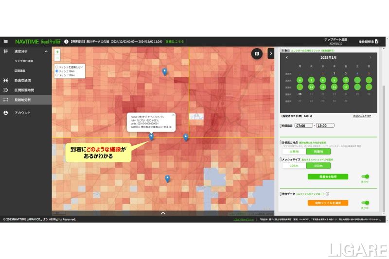 「地物情報アップロード機能」では、「道路プロファイラー」の各分析結果(リンク旅行速度・断面交通流・発着地分析)画面において、地点や施設情報を重ねて表示できる。地点や施設情報は、利用者が用意した任意の地点に関する緯度経度を羅列したCSV形式のファイルをアップロードすることで追加可能だ。これにより、特定施設周辺の渋滞状況や自動車による来訪傾向を可視化できるため、自治体や建設コンサルタント業界、店舗開発を中心としたマーケティング業界に活用できるという。