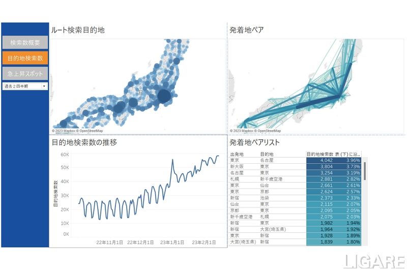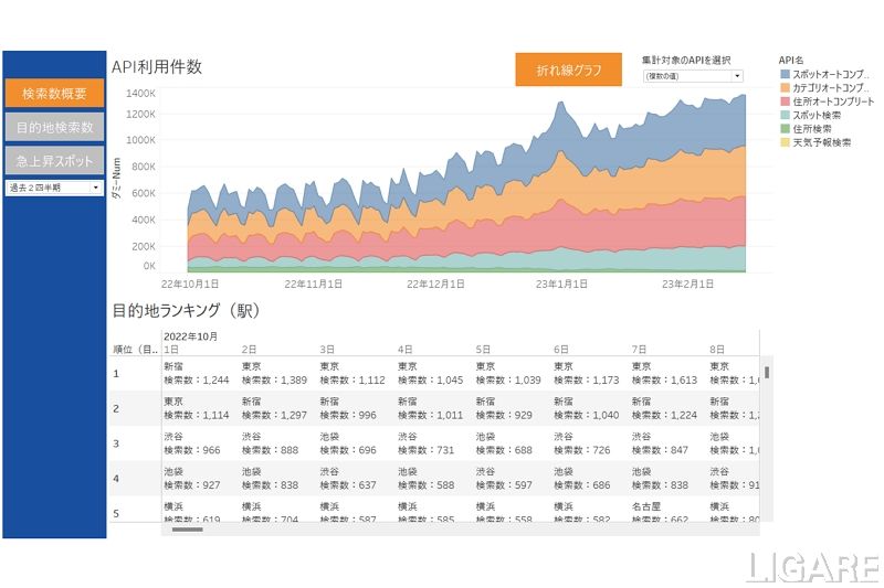 同サービスで提供する内容は、「目的地検索」と「検索数概要」の2つに分類される。「目的地検索」では、ルート検索目的地の伸び率、ルート検索目的地ランキング、目的地検索数の推移、ルート検索発着地ランキングを把握できる。「検索数概要」では、ユーザーが利用している各種APIの利用回数をグラフで確認することが可能だ。なお、同社は、今後もより使いやすいツールとなるよう分析対象データの拡大や機能拡充を検討していると述べている。