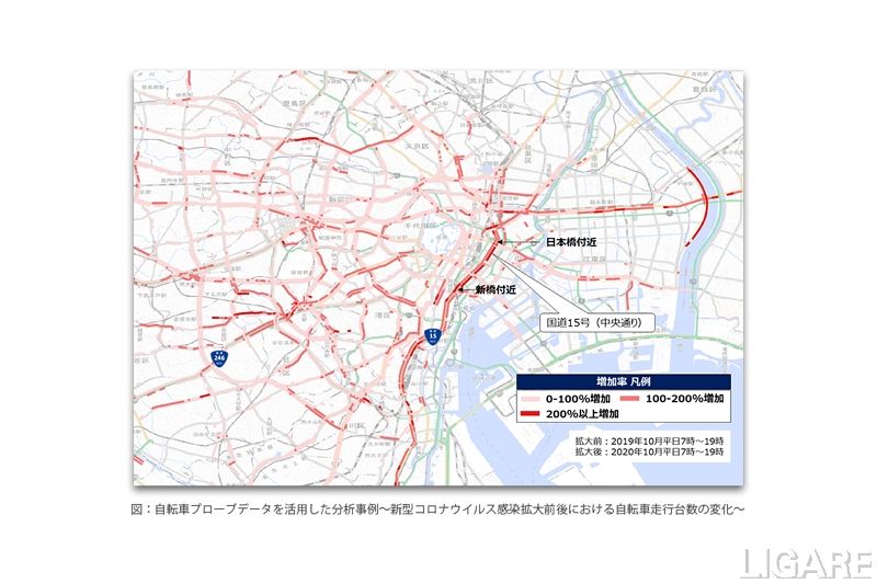 この分析では、感染拡大後は幹線道路を中心に自転車走行台数が増加しており、密を避けた交通手段である自転車の需要の高まりが伺える。また、オフィス街である国道15号(中央通り)日本橋~新橋付近では200%以上増加した区間もあることから、営業での移動や通勤などでの自転車利用も一定数存在することが示唆されている。なお、同社は、今後はより便利に利用してもらえるよう機能拡充を行い、さらなるサービスの向上に努めると述べている。