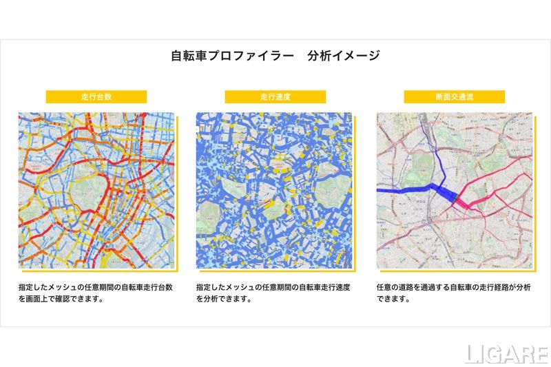 「自転車プロファイラー」は、「道路プロファイラー」同等の機能を搭載する自転車に特化したシステムだ。自動車に加えて、自転車においても道路開通や工事規制前後での交通状況の分析や自転車ユーザーに利用されやすいエリア・道路の把握ができる。これにより、安全で快適な自転車走行環境の整備やサイクルツーリズム、自転車サービス(シェアリング等)の推進、自転車に関連するマーケティングなどに活用できる。