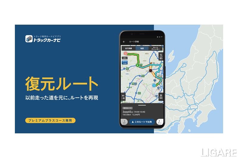 株式会社ナビタイムジャパンは、トラック専用カーナビアプリ「トラックカーナビ」で、過去の走行ログを使ったルート検索ができる「復元ルート」機能を提供開始する。