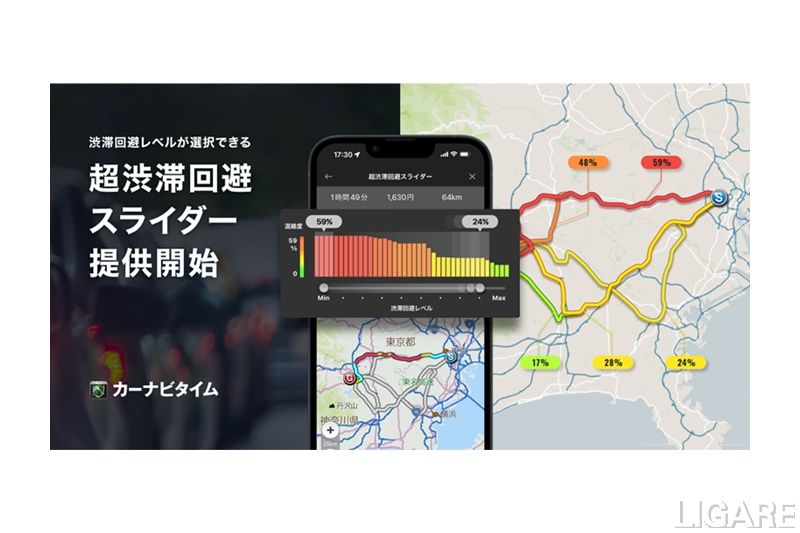 株式会社ナビタイムジャパンは8月9日、カーナビアプリ「カーナビタイム」で渋滞回避レベルの異なる複数の渋滞回避ルートをユーザーが選択できる「超渋滞回避スライダー」を提供開始すると発表した。