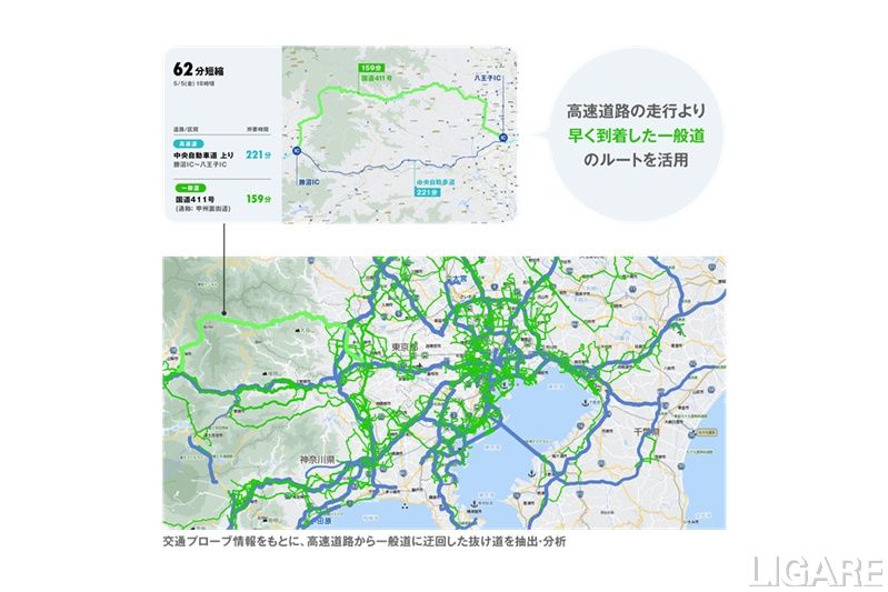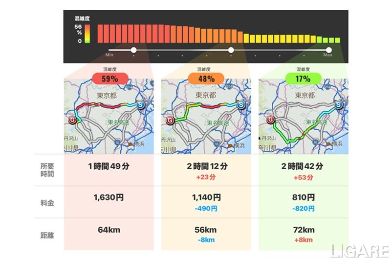 また、同社によると、特に大型連休など長距離にわたって長い渋滞が発生するときなどは、一般道に降りて走行することで、走行距離が大幅に増えるが所要時間を1時間以上短縮できるケースがあるという。
