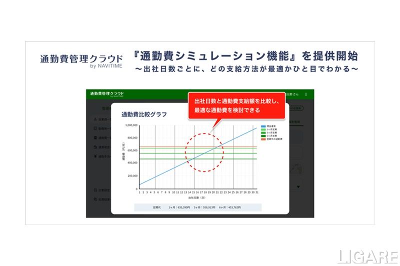 株式会社ナビタイムジャパンは8月14日、従業員の正確な通勤費をシステム管理できるWebサービス「通勤費管理クラウドby NAVITIME」で、「通勤費比較グラフ」機能を8月16日より提供開始すると発表した。