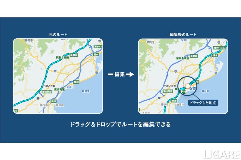 ルート編集機能では、「トラックカーナビ(Web版)」でルート検索後に、地図上のルート線をドラッグ&ドロップできるようになり、通りたい道路や交差点に合わせて任意にルートを編集することが可能となる。