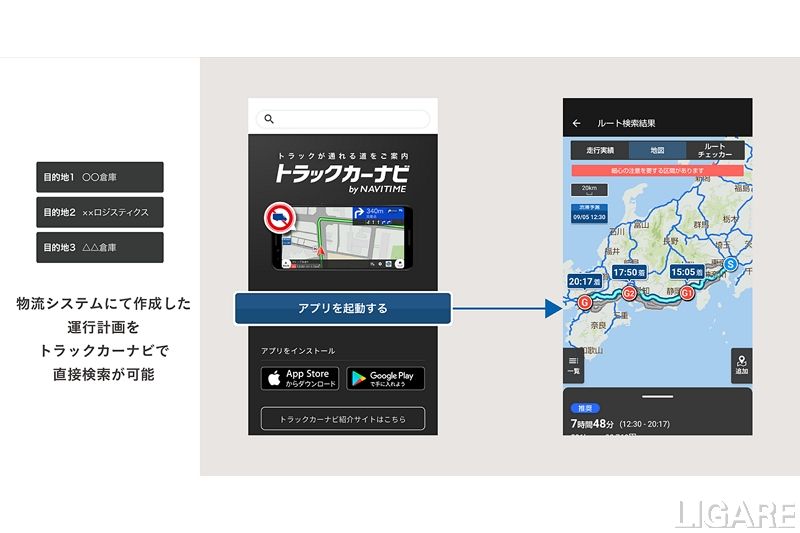 また、同機能では、物流システムからメール等で共有されたURLをドライバーのスマートフォンでタップするだけで、運行計画が反映された状態で「トラックカーナビ」を起動できる。このため、正確かつ簡単にドライバーが運行ルートを確認・走行開始することが可能だ。