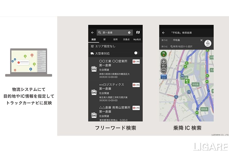 くわえて、ルートではなく地点リストでの連携や、途中で目的地を追加したい場合、高速道路の指定した区間のみを走行してほしい場合には、地点単位・インターチェンジ(IC)単位でも反映できる。ドライバー向けの機能がある場合でも、車両サイズや大型車規制情報を考慮したトラック専用ルートを検索できる「トラックカーナビ」と簡単に連携できることで、ドライバーが安心・安全に運転できる環境を提供可能だ。