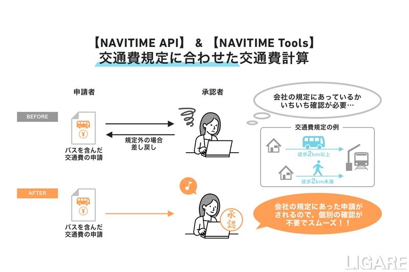 また、例えば人材派遣企業のように、雇用先(出勤先)が多岐にわたっているケースや、契約に伴って派遣先が度々変更になるケースなどでは、大量の交通費申請を処理する必要がある。ナビタイムジャパンは、このようなケースを抱えている企業にとって、業務効率の改善に大きな効果が見込めると想定している。