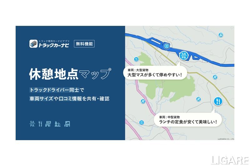 株式会社ナビタイムジャパンは11月7日、トラック専用カーナビアプリ「トラックカーナビ」で、ユーザーが口コミ情報とともに休憩地点を投稿しあえる「休憩地点マップ」を提供開始すると発表した。