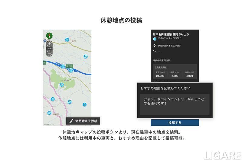 なお、休憩地点の口コミ情報を投稿する場合は、現在地周辺の上記5カテゴリーの施設から、投稿したいスポットを選ぶと、おすすめの理由を記入できる。自分の選択している車両サイズ情報と合わせて投稿されるという。