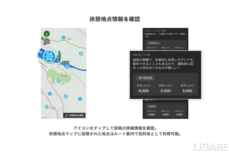 「休憩地点マップ」では、SA・PA/トラックステーション/道の駅/コンビニ/食事・軽食の5カテゴリーの施設が各アイコンで地図上に表示されている。さらに、詳細情報では、各施設の設備や駐車台数などの情報にくわえ、ユーザーの口コミ情報を見ることができる。