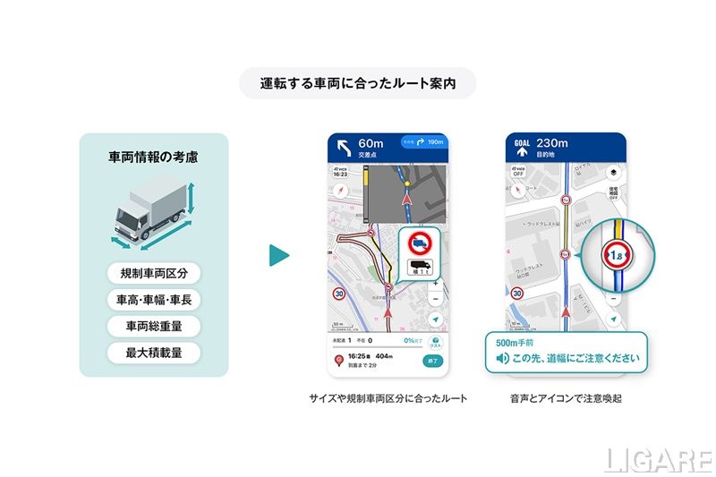 「配達NAVITIME」は、同社が提供する配達員の業務をサポートするアプリだ。今回表示する新機能は、宅配トラック(普通貨物自動車、準中型貨物自動車)に対応し、運転する車の車高・車幅・重量制限や車種別通行止め規制を考慮したルート案内を行う。くわえて、注意が必要な車高・車幅・重量制限や車両通行規制のある道路をアイコンで地図上に表示。ナンバープレート入力もしくは車検証の読み取りによる車種情報登録機能も追加している。さらに、車高等を考慮したルート案内では、交通規制上は通行できるが車幅や高さに余裕のない場所では、「この先、高さ(道幅)にご注意ください」と音声とアイコンで注意喚起するという。