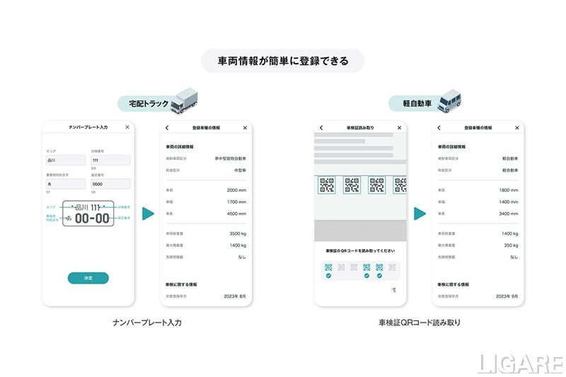 くわえて、現在走行中の道路上に進入禁止箇所がある場合には、地図上にアイコンを表示する。走行している方向を考慮してアイコンを表示するため、指定方向外進行禁止道路での誤進入を防ぐことができる。時間帯によって進入可否が切り替わる道路にも対応している。一方、車種情報登録機能では、ナンバープレート情報の入力もしくは、スマートフォンのカメラで車検証の二次元バーコードを読み取ることで、車両区分等を登録できるという。